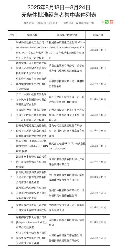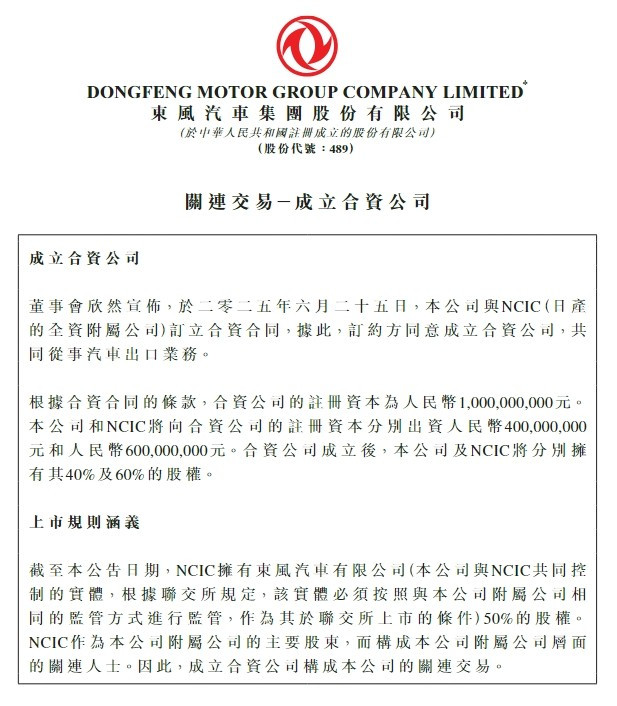 据媒体报道,8月29日,市场监管总局发布2025年8月18日—24日无条件批准经营者集中案件列表,其中包括日产(中国)投资有限公司与东风汽车集团股份有限公司新设合营企业案。这意味着双方合资成立的出口公司已获得官方“绿灯”,距离真正落地又近了一步。